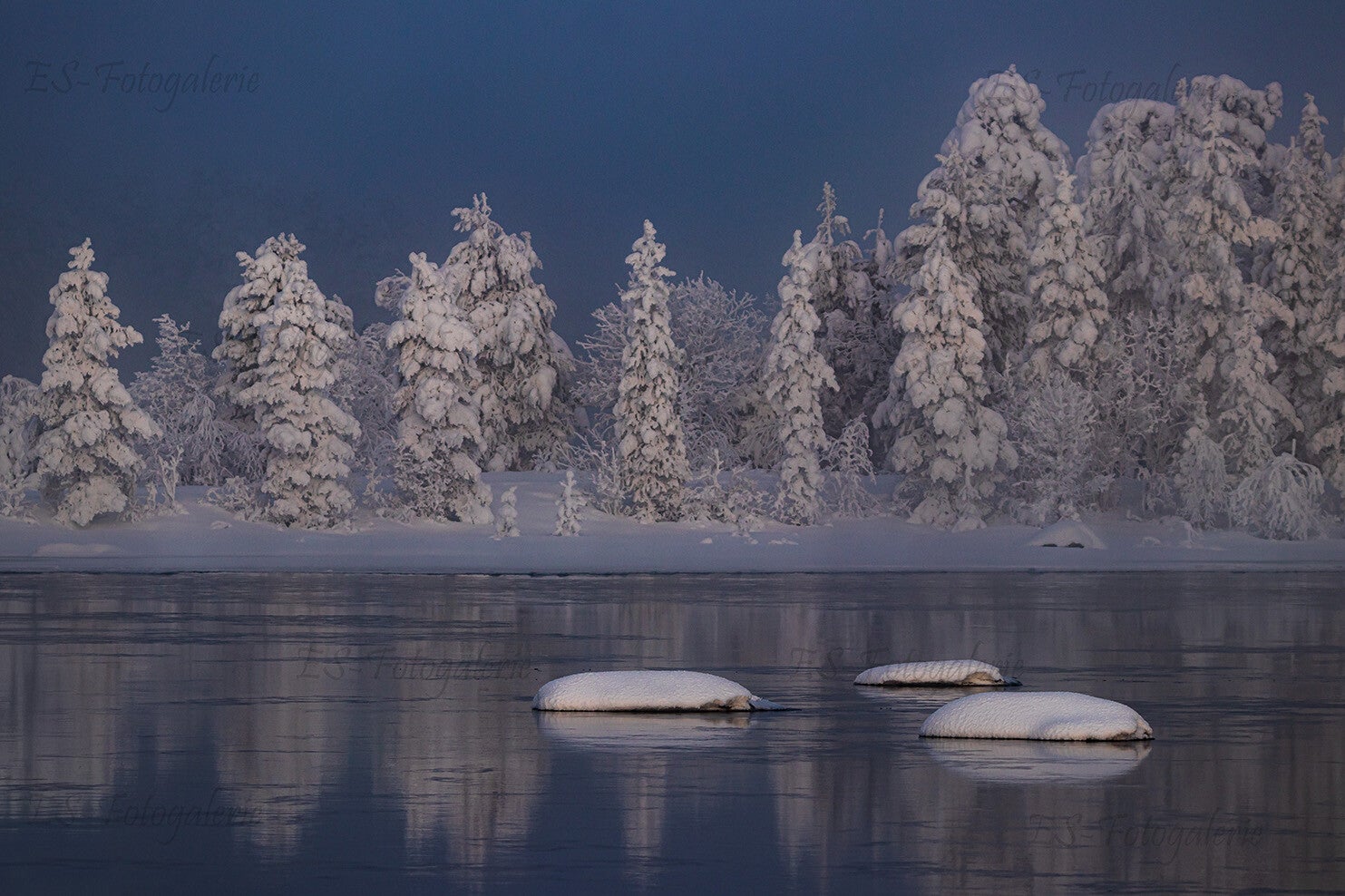 Die tief verschneite Landschaft von Arjeplog liegt im goldenen Winterlicht, während der eisige Fluss ruhig durch die stille nordische Natur zieht. Frost, Nebel und Sonne verleihen der Szene eine fast magische Ruhe der Lappland-Wildnis.